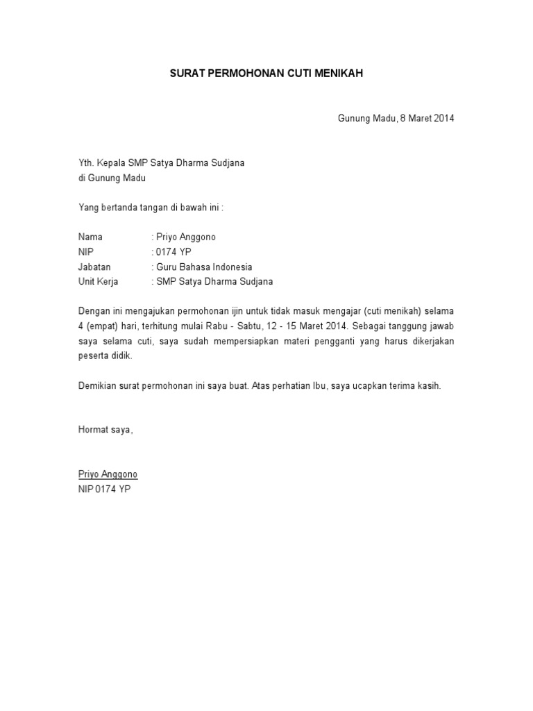 Uncategorized Contoh Surat Pengajuan Cuti Nikah Dan untuk lebih jelasnya kita dapat melihatnya pada contoh surat cuti menikah yang resmi berikut dibawah ini